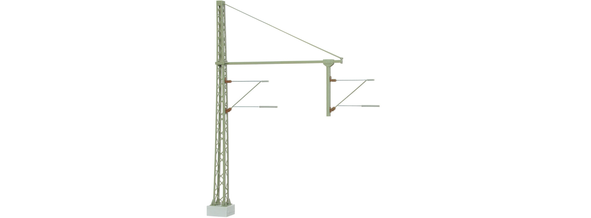 Komplett mit Turmmast, fertig montiert und lackiert. Mit 2 elektrisch getrennten Auslegern. Die Auslegereinheiten sind frei verschiebbar und umklipsbar. Mit rückseitiger Aussparung zur Aufnahme weiterer Ausleger. Filigrane Metallausführung mit eingeprägten Nietenimitationen. Maximale Spannweite: 117,5 mm, Höhe: 150,9 mm.