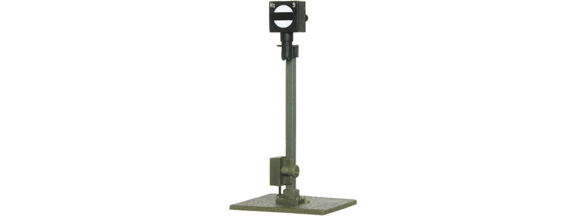 Mit filigranem Messingmast in originalgetreuer Lackierung und Unterflur-Kompaktantrieb. Die Blende ist beweglich und beleuchtet. Bei der Bahn gibt es verschiedene Sperrsignal-Bauformen. Diese Ausführung mit Flanschfuß steht an Gleisen einzeln. Signalbilder Sh0 und Sh1. Höhe: 35 mm.