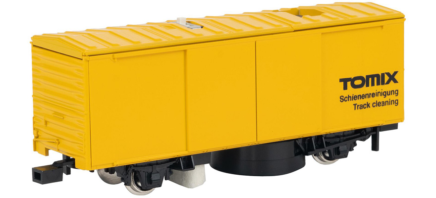 Der Schienenreinigungswagen von Tomytec zeichnet sich durch eine schlichte aber real-getreue Formgebung aus. Mit dem typischen Goldgelb, RAL 1004, folgt er der Farbgebung nicht nur der Bahndienstfahrzeuge der Deutschen Bahn sondern auch anderer europäischer Bahngesellschaften. • Geeignet für Gleich- und Wechselstrom. • Zwei unterschiedlich große Reinigungsscheiben sorgen für die Reinigung von Außen- und Mittelleiter. • Mit dem beiliegenden Schwamm werden die Gleise poliert. • Staubsauger sammelt losen Staub und Kleinteile von den Gleisen. • Mittels Propeller und Luftstrom wird der Müll im Behälter gesammelt. • Der Behälter ist durch den abnehmbaren Deckel problemlos zu entleeren. • Reinigungsscheiben und Propeller können einfach ohne Werkzeuge getauscht werden. • Durch die NEM-Kupplungsaufnahme kann die gewünschte Kupplung verbaut werden (Kupplungen liegen nicht bei). • Zum Betrieb der Funktionen werden zwei AA-Batterien benötigt (liegen nicht bei), zur Bewegung des Fahrzeuges wird eine Lok eingesetzt (liegen nicht bei). • Der Schienenreinigungswagen von Tomytec ist so konzipiert, dass er für einen Mindestradius von R = 360 mm geeignet ist. • Eine Digitalisierung des Fahrzeuges ist nicht möglich.